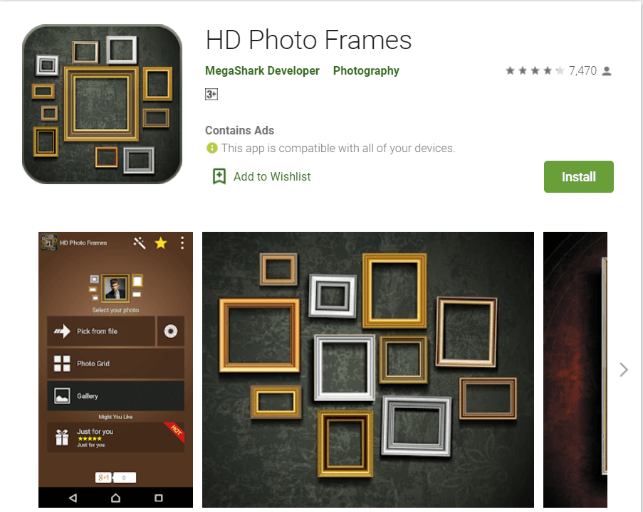 Как следует из названия, HD Photo Frames поставляются с несколькими HD-кадрами для вас. Это одно из лучших приложений для фоторамок для телефонов Android. Вы можете получать обновления фоторамки почти каждый день на HD Photo Frames. Кроме того, он предлагает простой и удобный интерфейс. Вы можете добавить до 9 фотографий в коллаж и выбрать более 200+ эффектов. В нем доступно более 5000 стикеров. Используйте это приложение, чтобы добавлять роскошные рамки к вашим фотографиям