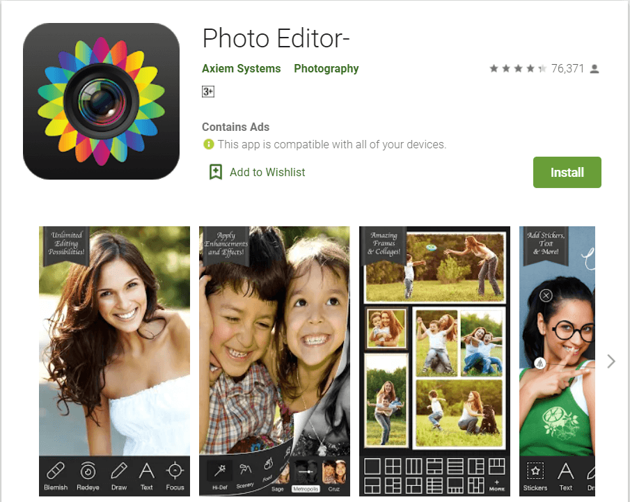 Это приложение «Photo Editor», разработанное Axiem Systems, является одним из лучших приложений для редактирования, которое поставляется с множеством рамок. Вы можете выбрать более 50+ кадров и оптимизированных наложений. Кроме того, Photo Editor также предлагает функции рисования и рисования, фильтры и множество наклеек. Более того, он также предлагает различные эффекты редактирования лица. Вы также можете использовать опцию камеры в этом приложении, чтобы делать фотографии HD ( высокой четкости ).